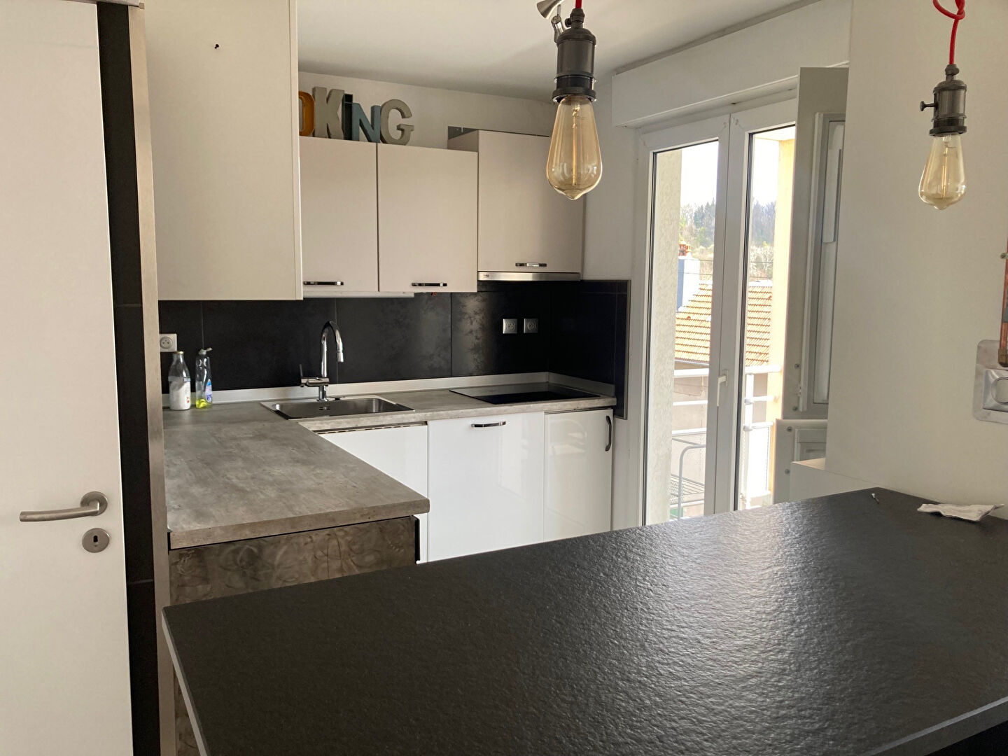 T2 situé 11a Avenue de la Vaite entrée sur pièce principale avec placard équipé, cuisine équipée ouverte avec meuble bar, une chambre avec coin salle d'eau (meuble vasque, douche carrelée, sèche serviette), WC séparé avec lave mains, Terrasse, chauffage ind électrique, cumulus, Fibre, parking extérieur LIBRE