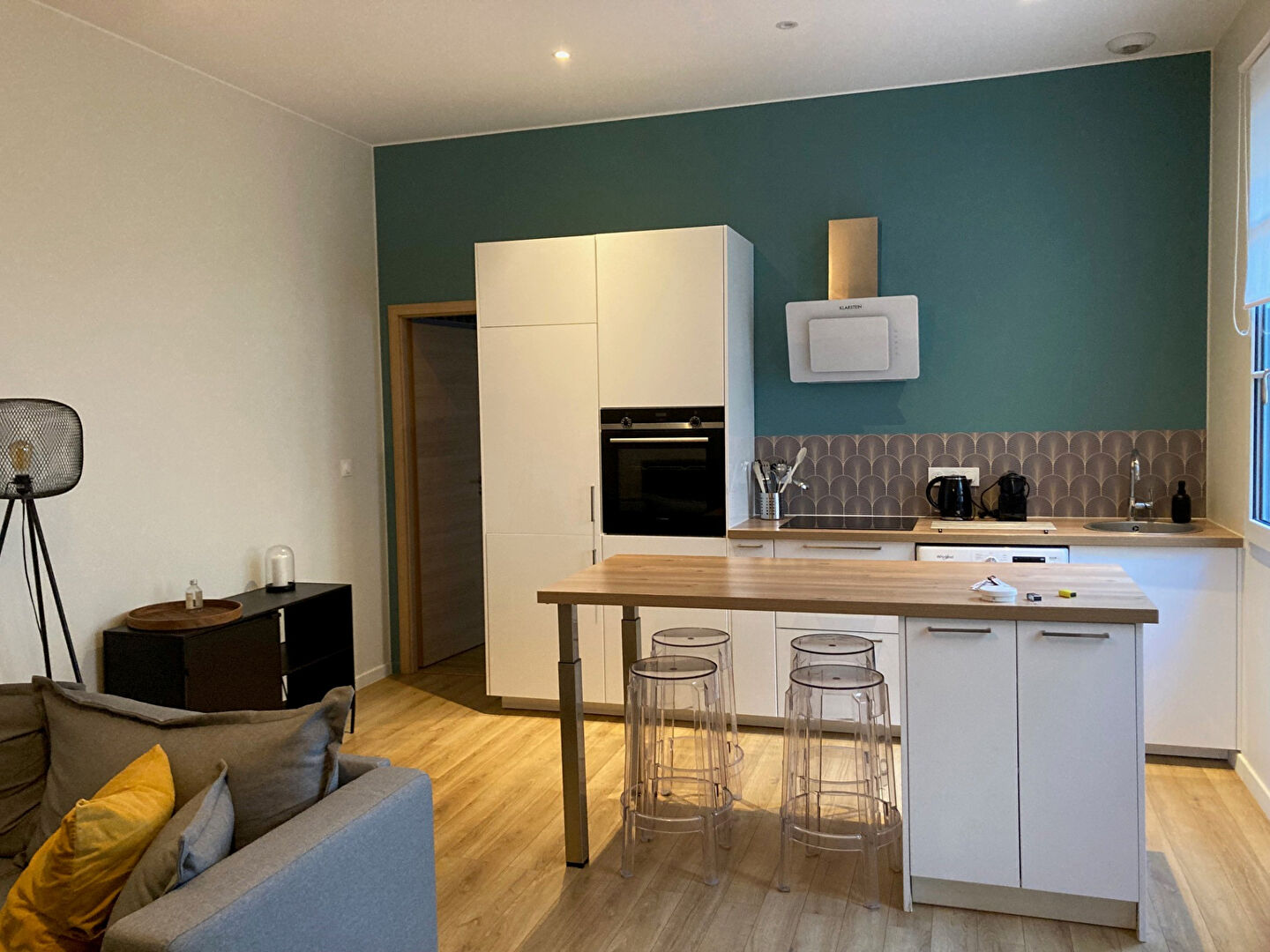 REF : 8009 T1 bis meublé situé 6 Grande Rue, 40 m², entrée sur pièce principale avec cuisine ouverte équipée (frigo, plaque de cuisson, hotte, petit lave-vaisselle et lave-linge séchant à titre gracieux), chambre avec placard équipé, salle d'eau ouverte (douche carrelée, meuble vasque, WC suspendu, sèche serviette), chauffage ind électrique, cumulus, digicode, fenêtres double vitrage bois, volets roulants électriques, LIBRE
