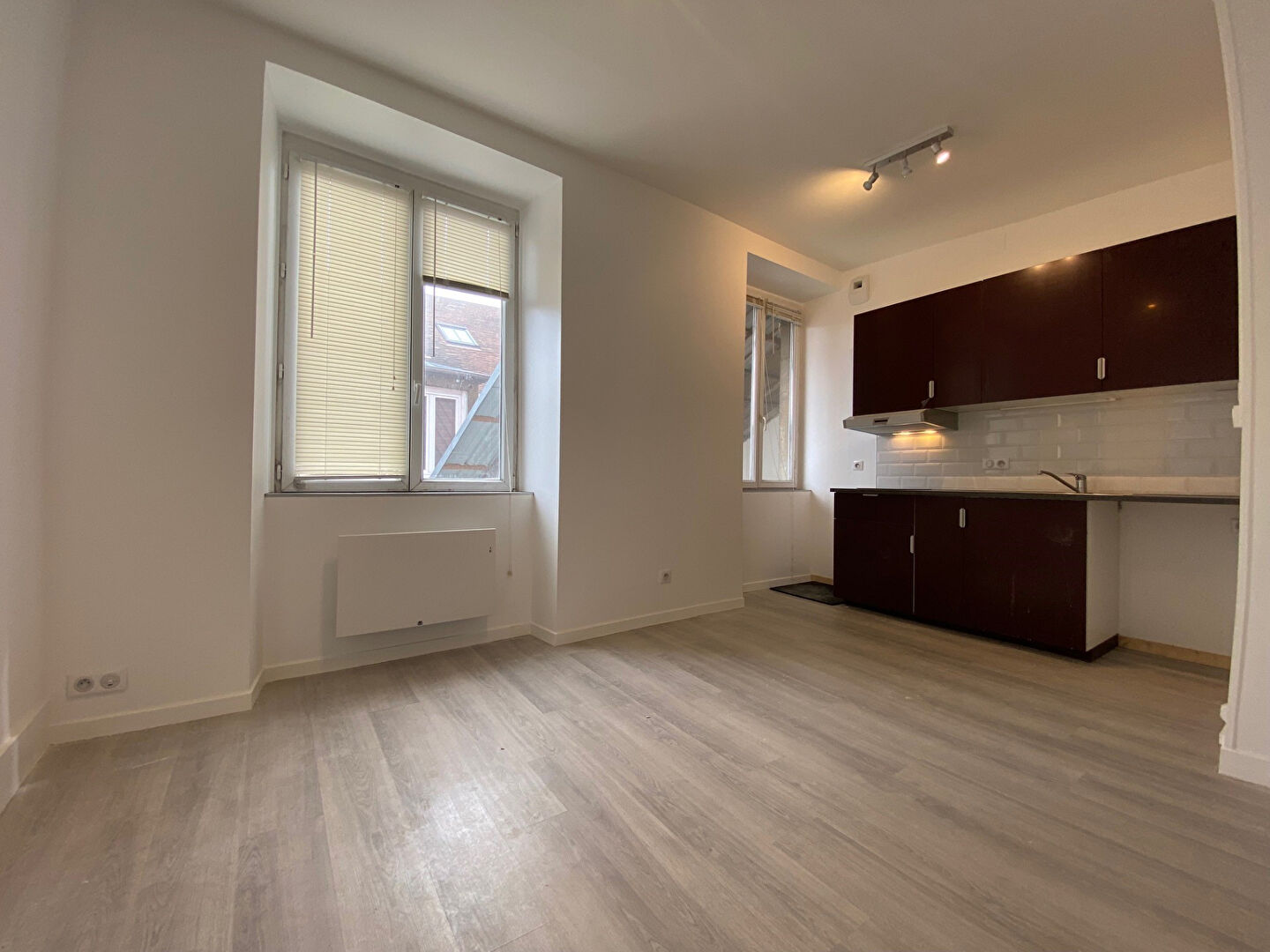 T1 BIS rénové rue Gustave Courbet, CENTRE VILLE, 27 m², 3° étage/cour, entrée avec placard, cuisine équipée ouverte (plaques cuisson vitro + hotte + meubles hauts et bas + branchement machine à laver) sur pièce à vivre, 1 chambre, chauffage individuel électrique avec radiateur à économie d'énergie, double vitrage, Actuellement loué 512 euros Hors Charges - Classe Energie : D