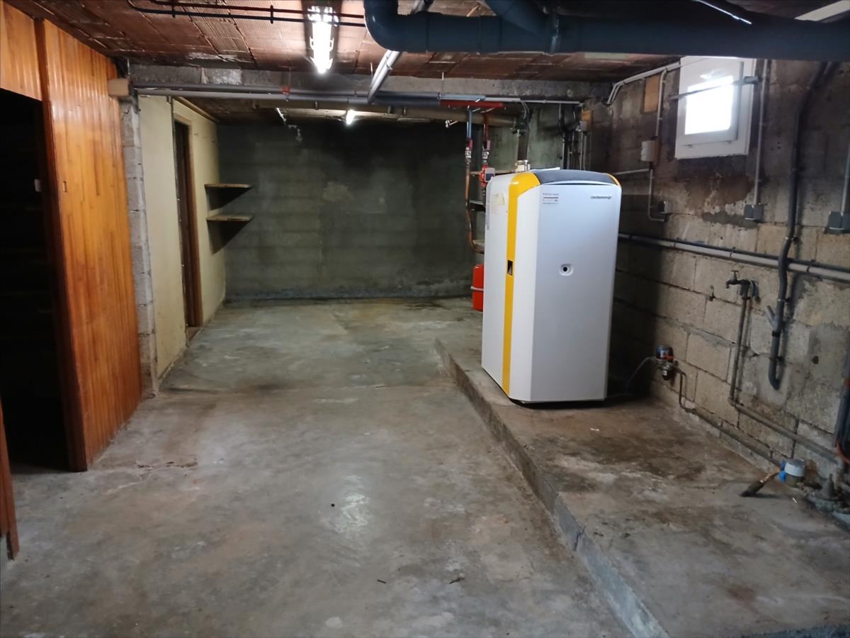 Le sous-sol comprend un garage avec un point d'eau, une partie chaufferie, un petit dégagement sous l'escalier et une pièce de rangement.