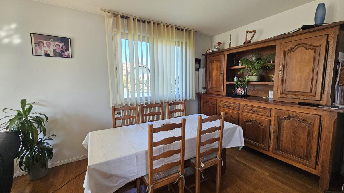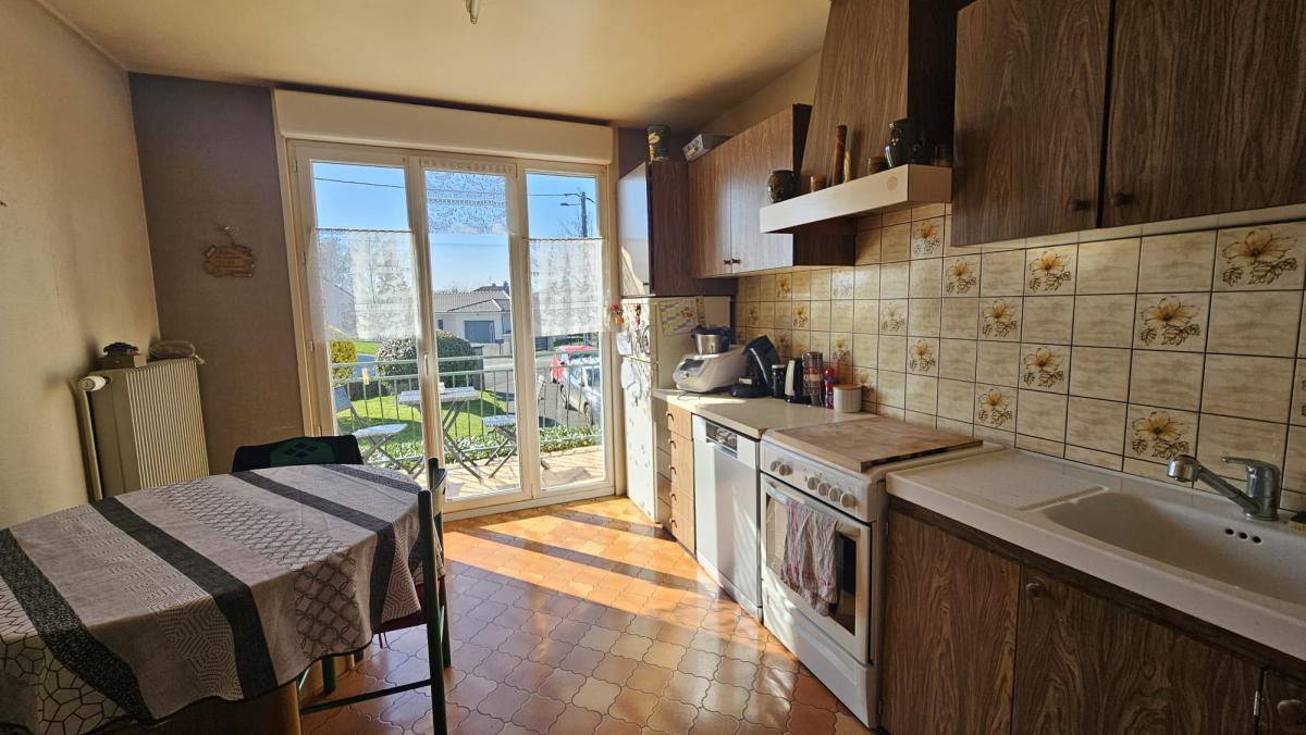 Au rez-de-chaussée, vous trouverez un hall d'entrée, une cuisine aménagée et semi équipée donnant accès à un balcon exposé plein sud, salon/séjour lumineux avec un poêle à bois, trois chambres, WC indépendant, salle de douche, rangements.