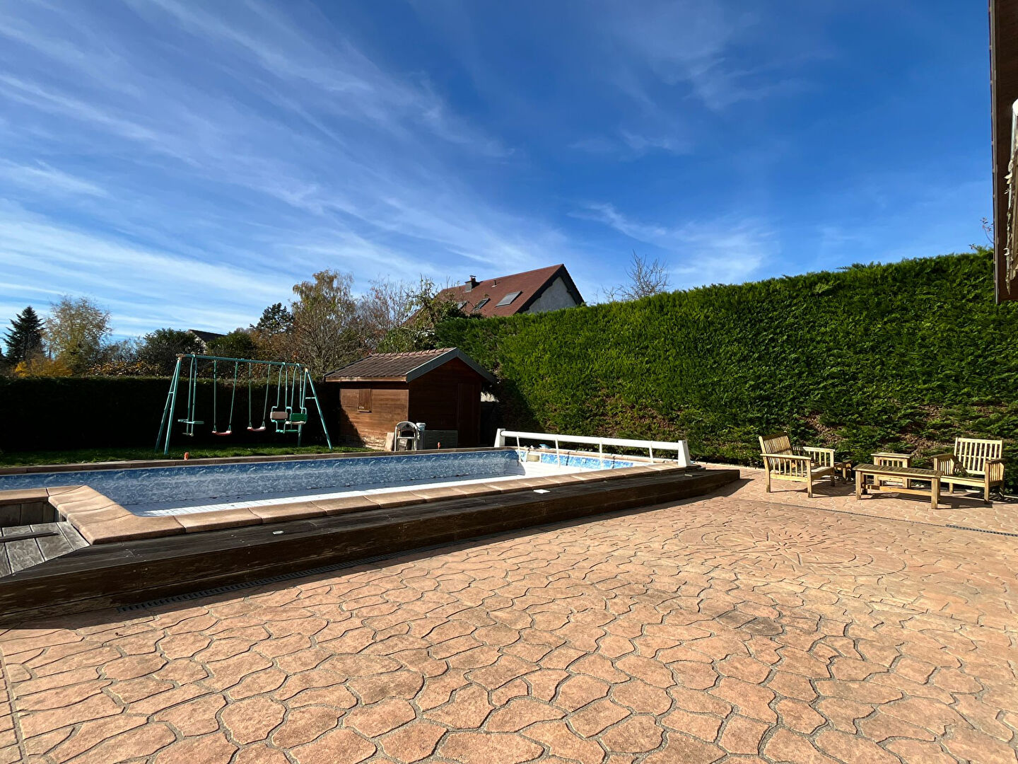 Piscine sans vis à vis avec grande terrasse.